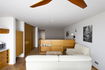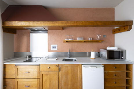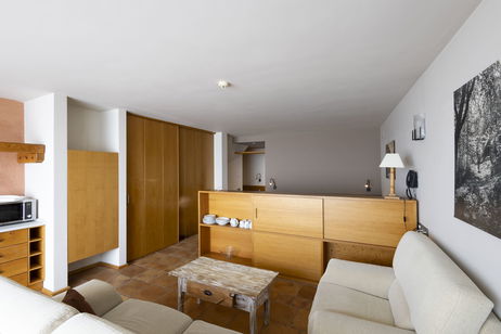 Els nostres estudis dobles són apartaments en planta i distribució oberta. Disposen d´una habitació doble oberta a sala d´estar-menjador i cuina amb sortida a terrassa amb vistes. Bany amb terra de pedra natural i dutxa. Terra de gres de Breda.