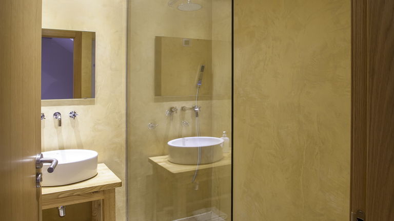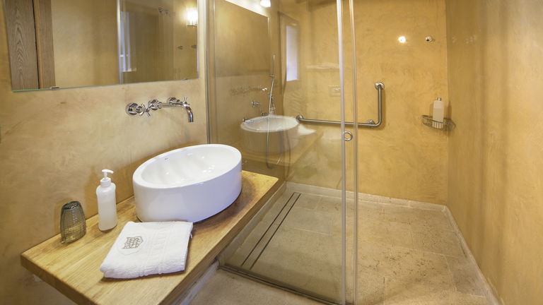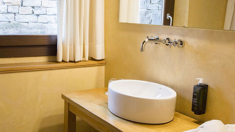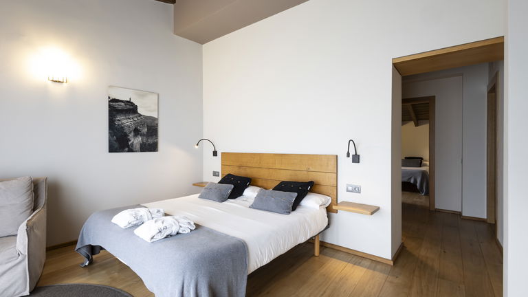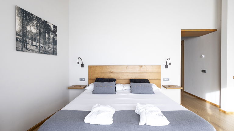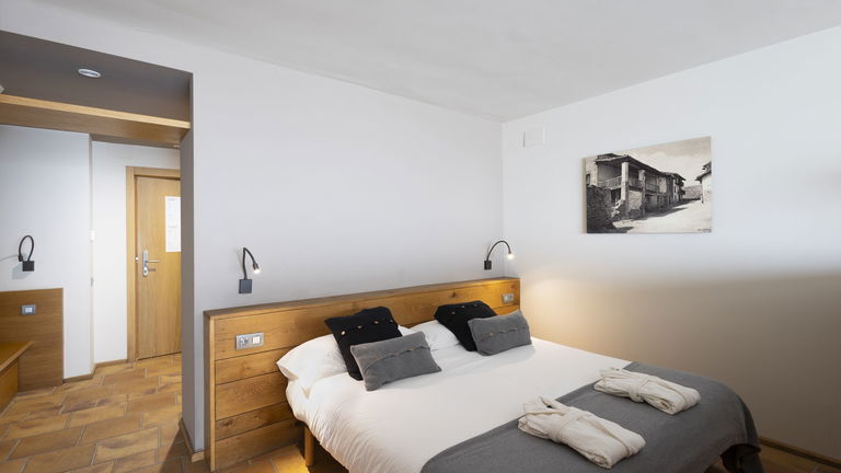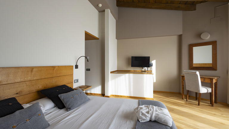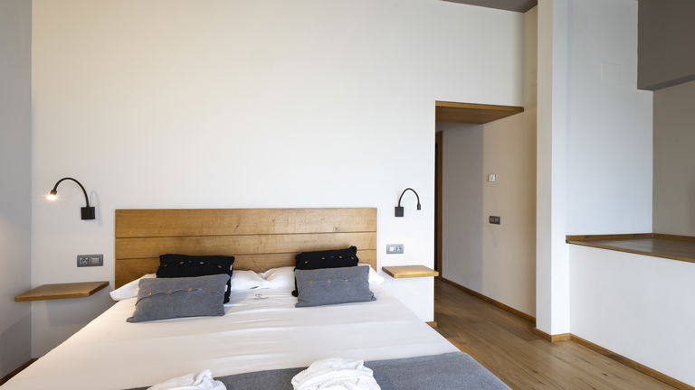 Les nostres habitacions dobles es troben a la part més elevada de l'edifici. Són habitacions molt àmplies i amb molta llum. Parquet de roure natural, TV, bany amb pedra natural (banyera) i balcó amb vistes increïbles.