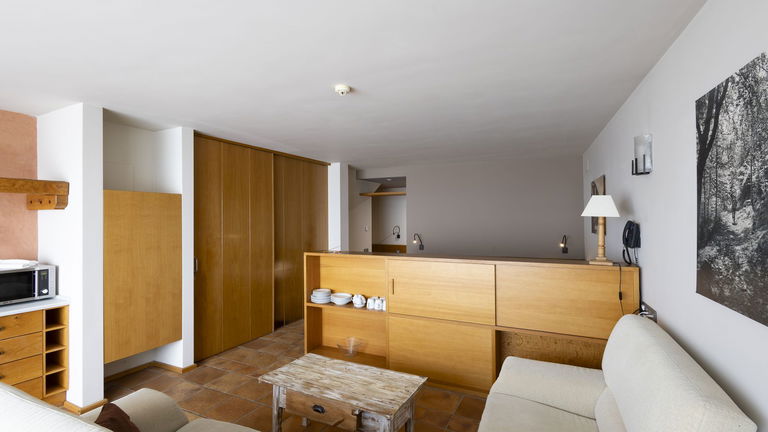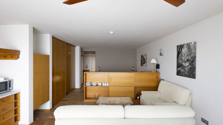 Els nostres estudis dobles són apartaments en planta i distribució oberta. Disposen d´una habitació doble oberta a sala d´estar-menjador i cuina amb sortida a terrassa amb vistes. Bany amb terra de pedra natural i dutxa. Terra de gres de Breda.