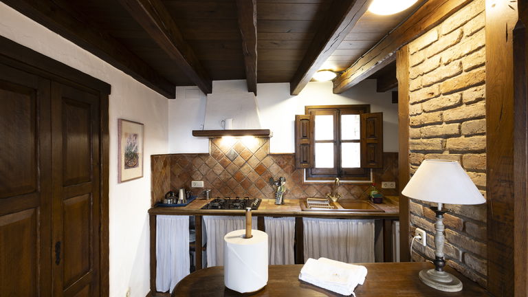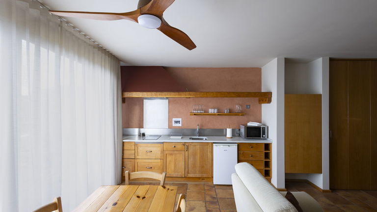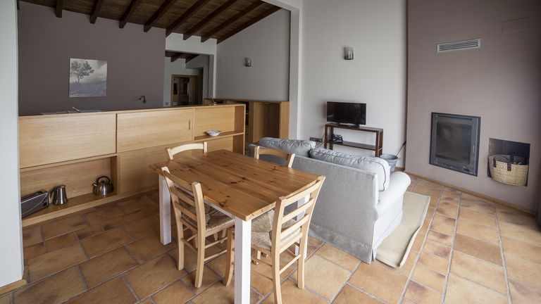 La planta baixa consta d'una habitació doble oberta a saló-menjador, cuina petita, i sortida a terrassa privada. Hi ha un bany amb dutxa i possibilitat d'afegir un llit supletori individual (pensat per a un nen/a). A la primera planta hi trobem l'habitació doble principal, amb balcó amb vistes increïbles, que comparteix un bany (banyera) amb una habitació doble secundària.