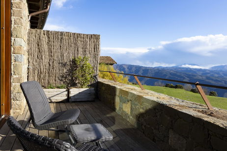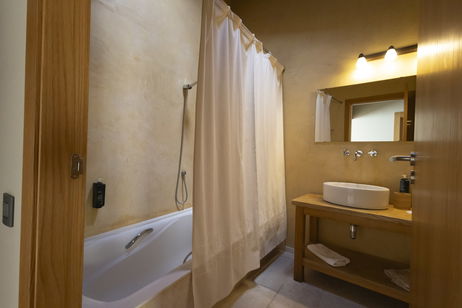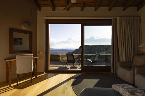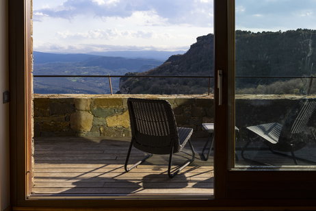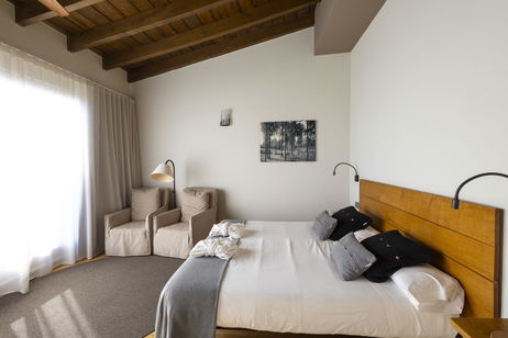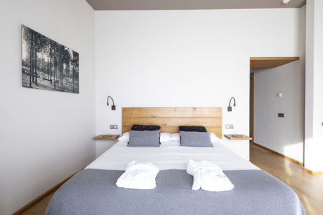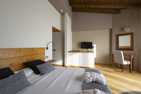 Les nostres habitacions dobles es troben a la part més elevada de l'edifici. Són habitacions molt àmplies i amb molta llum. Parquet de roure natural, TV, bany amb pedra natural (banyera) i balcó amb vistes increïbles.
